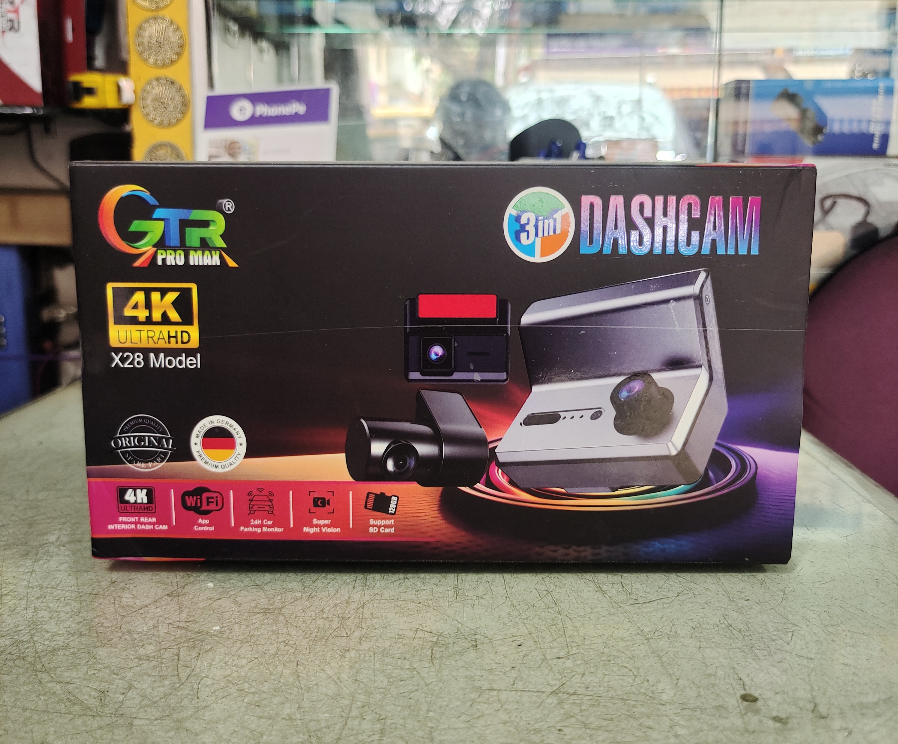 The product displayed is a GTR Pro Max X28 Model 3-in-1 4K Ultra HD dashcam. This dashcam features 4K resolution, Wi-Fi connectivity, night vision capabilities, and support for up to a 50GB (or larger, typically up to 256GB or 1TB) SD card for storage.